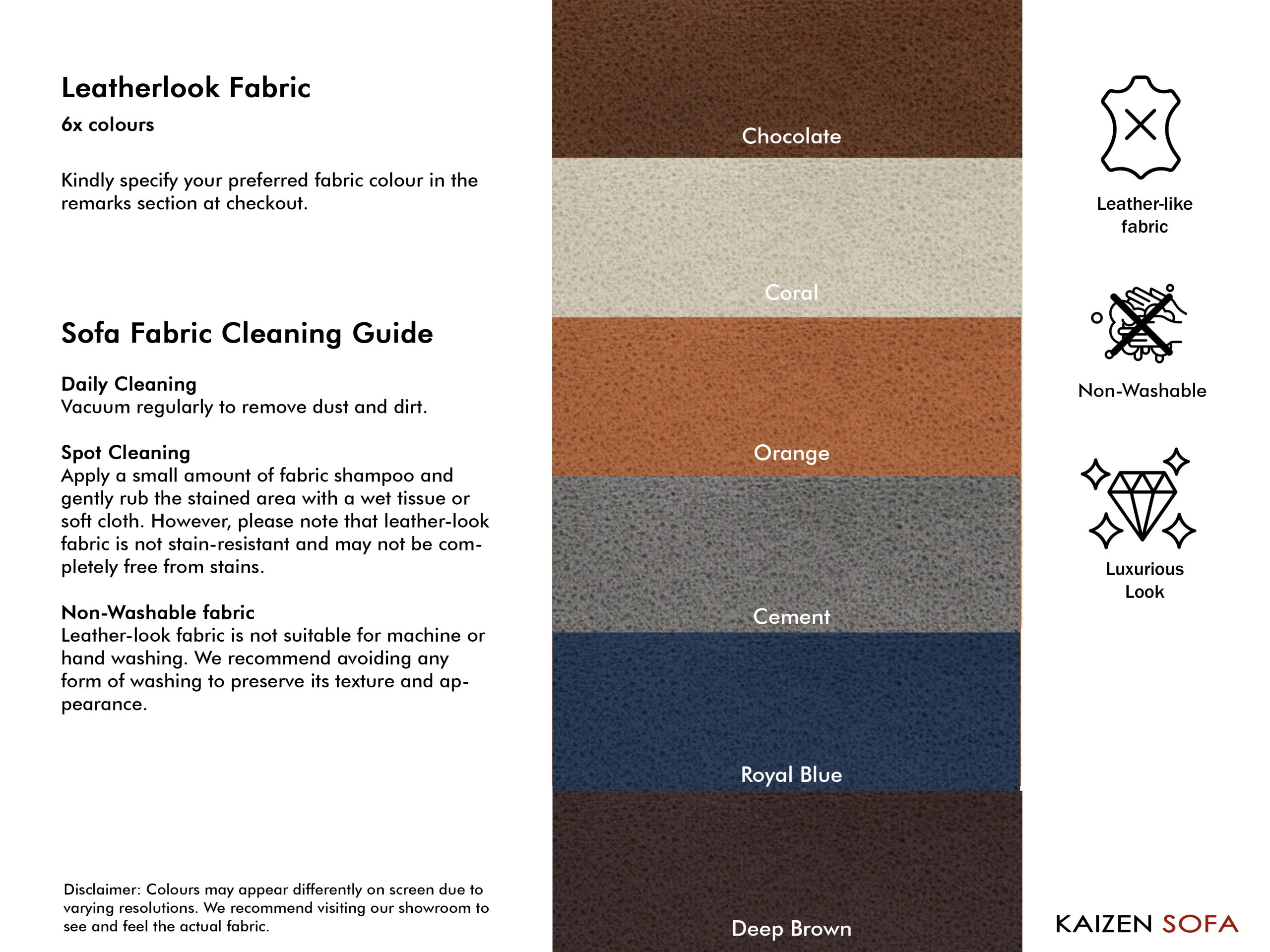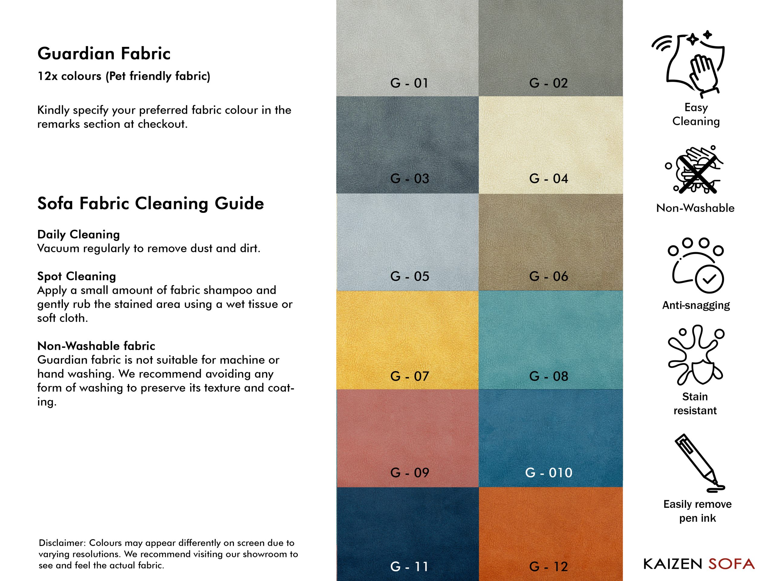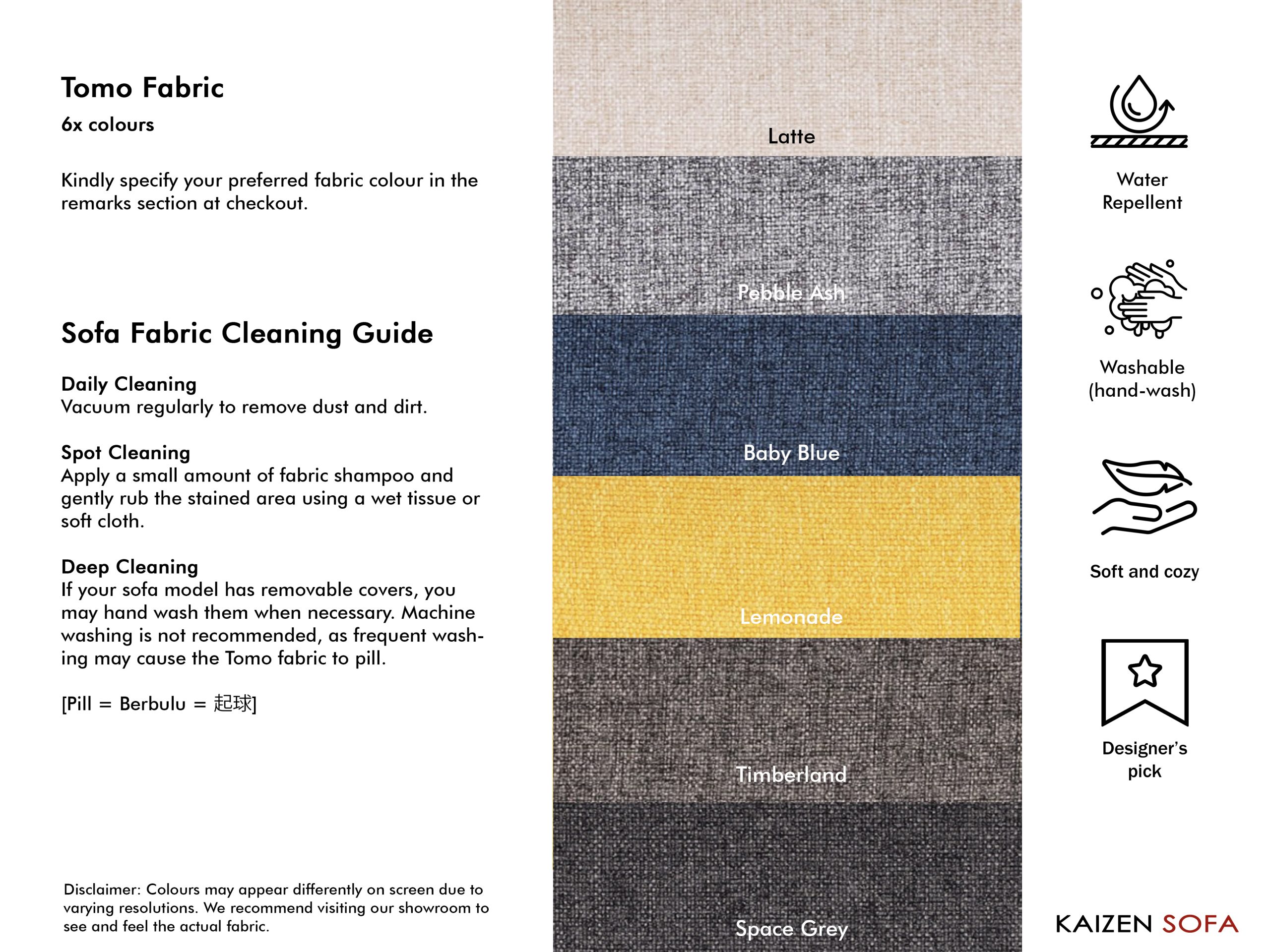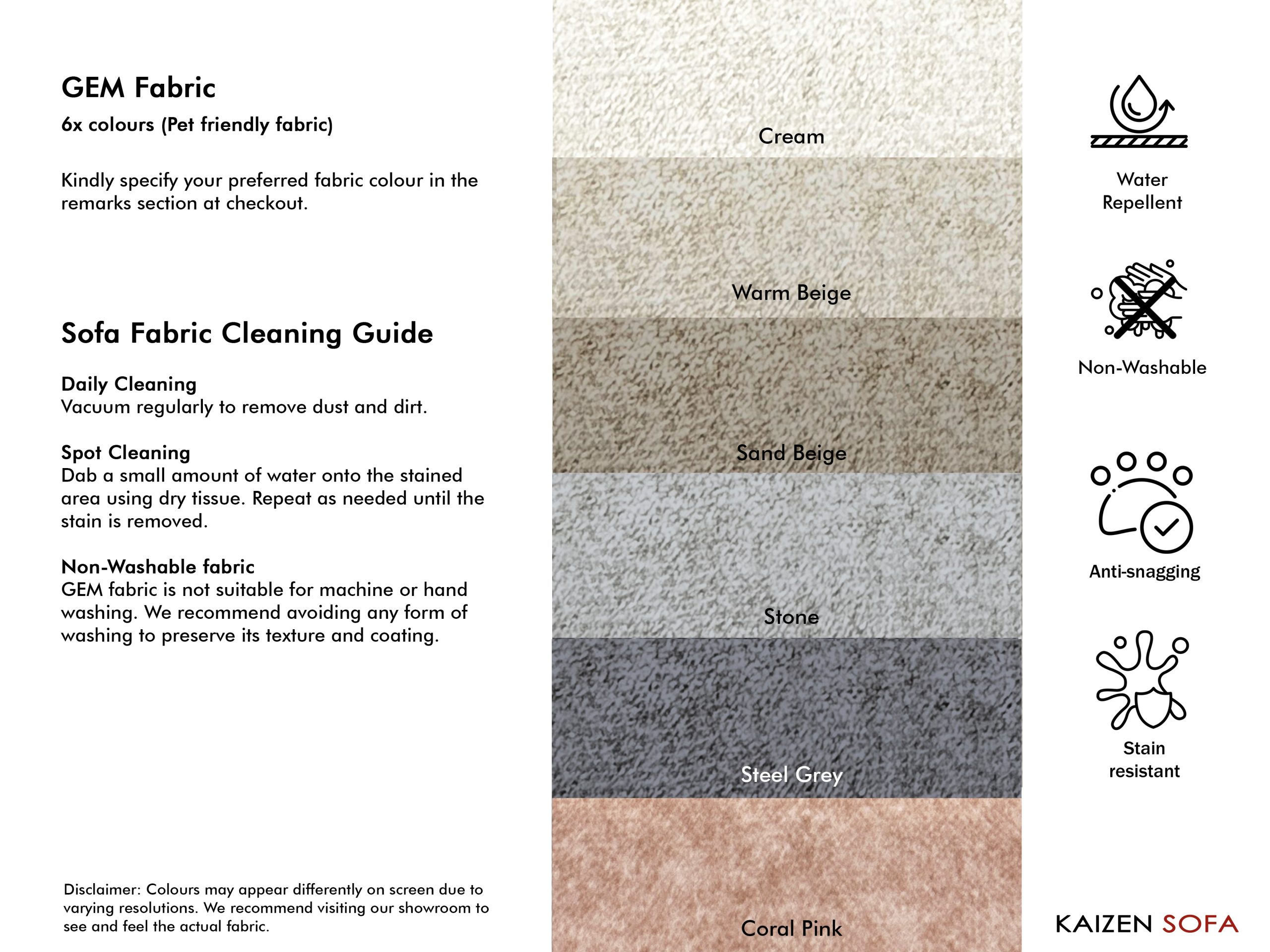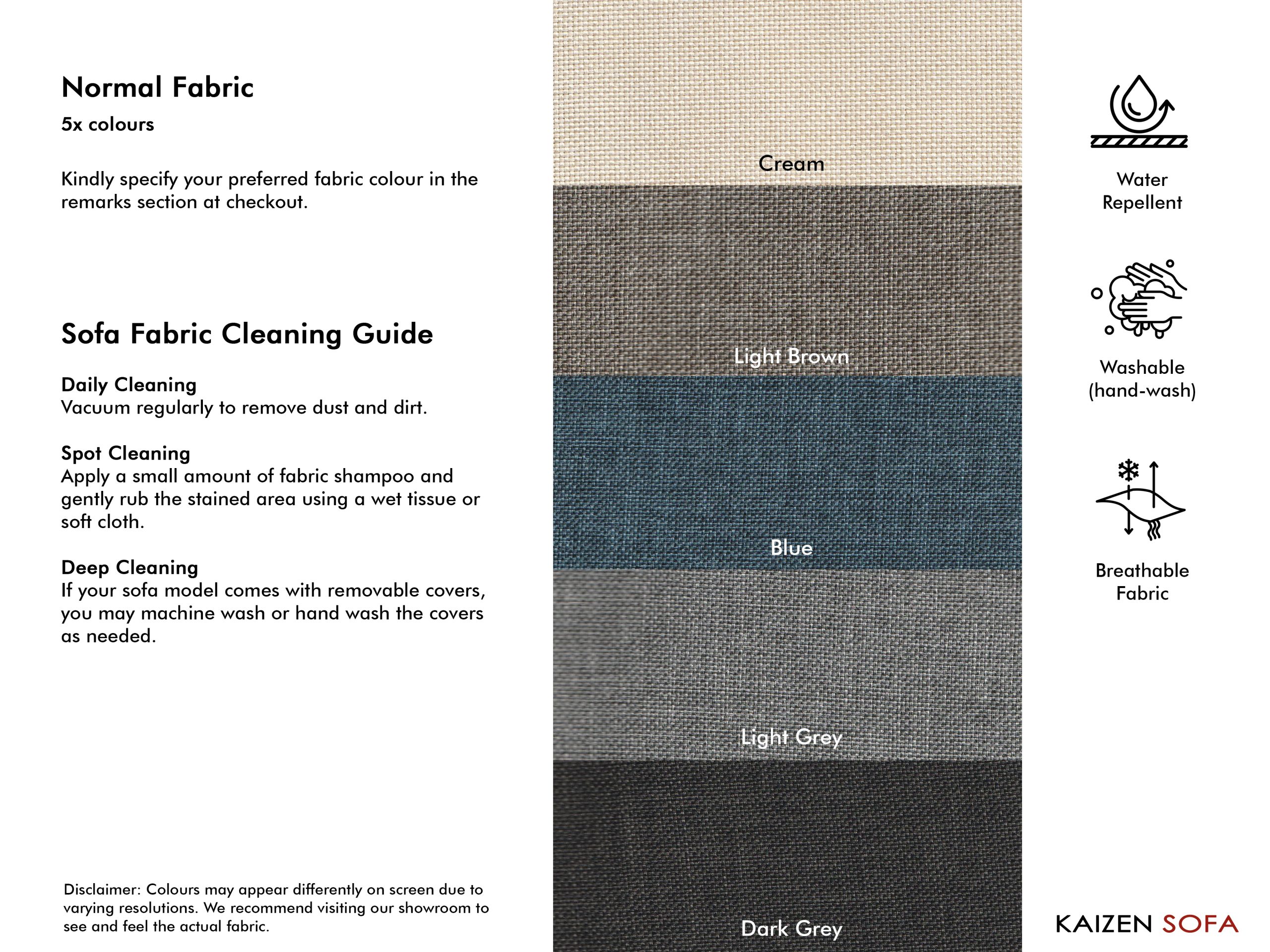 • Avoid expose to strong sunlight which can cause colour fading on fabric finishing